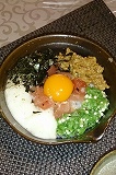 4・ご飯の上に、真ん中をあけてドーナツ状に、汁気を切ったサーモン、オクラ、長芋、納豆をのせる。